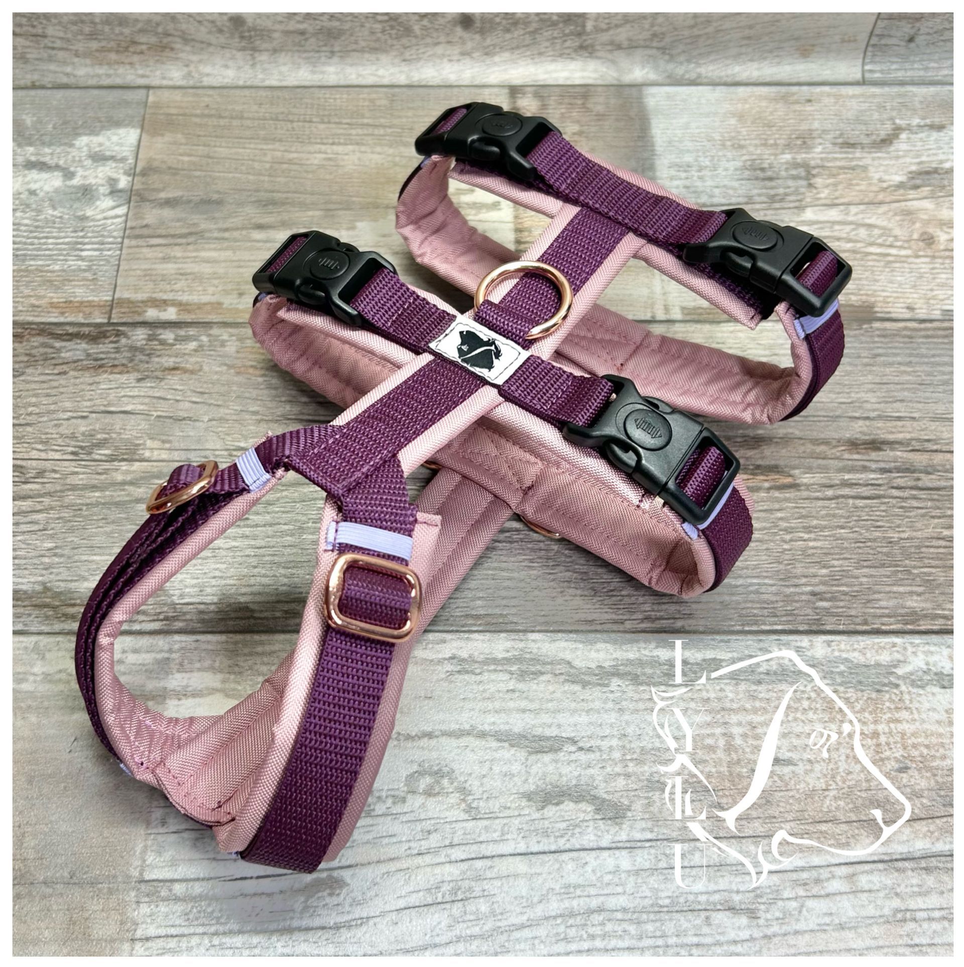 Optionally, a reinforced/split chest strap (prevents the harness from slipping), various colored fittings as well as rubber bands, reflectors, applications (motif on the back), neck buckle, etc. can be added.